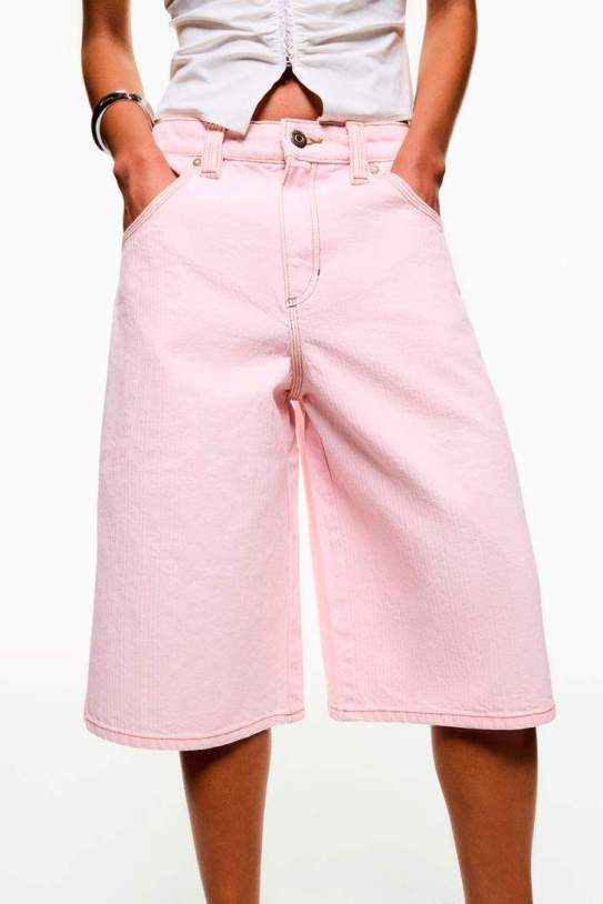 El model d'aquestes bermudes de Bershka compta amb una cintura amb travetes, permetent l'ús de cinturons per personalitzar l'ajustament. El tancament frontal de cremallera i botó metàl·lic assegura una subjecció ferma i pràctica. Les butxaques davanteres i posteriors funcionals ofereixen espai per portar petits objectes, mantenint la practicitat sense sacrificar el disseny. La longitud per sobre del genoll proporciona llibertat de moviment i una sensació de frescor, perfecta per a les temperatures elevades.