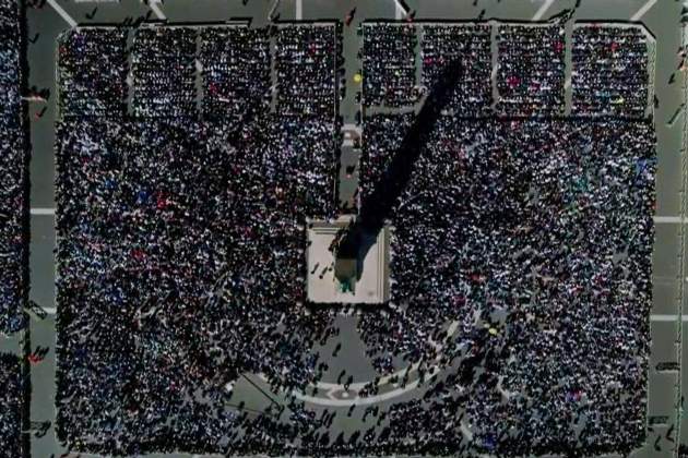 Mentre els caps d'Estat i altres representants polítics així com clericals prenen lloc, pels altaveus distribuïts per tota la plaça es recita l'Ave Maria en llatí. El so de la pregària queda ofegada pel so dels helicòpters de la policia.