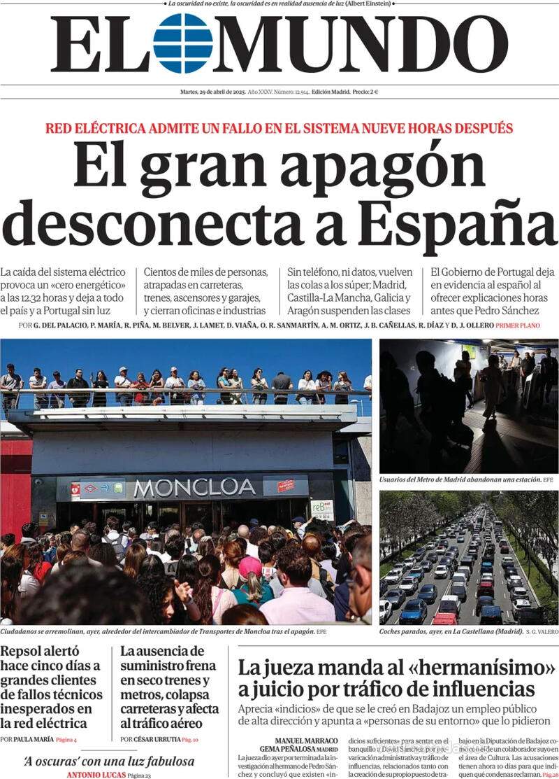 Cop d'ull també a la portada d'El Mundo, que apunta que la gran apagada “desconnecta Espanya” i parla del “zero energètic”. Tal com explicava aquest dilluns El Nacional.cat just després de l'apagada, un zero energètic és el col·lapse del sistema elèctric d'un país o una gran regió en el qual la xarxa de subministrament d'energia deixa de funcionar de manera completa. No es tracta només d'un tall de llum en una ciutat, sinó d'una interrupció massiva i generalitzada que afecta gran part de la població. Atenció perquè ja es pot acabar el món, però si hi ha una oportunitat per picar el crostó al president del govern espanyol o algun dels seus familiars, aquest diari l'aprofita: “La jutgessa envia l'‘hermanísimo’ a judici per tràfic d'influències”. La jutgessa de Badajoz que instrueix la causa contra David Sánchez Pérez-Castejón, germà del president del govern espanyol, ha proposat l'obertura de judici oral contra ell per suposats delictes de prevaricació administrativa i tràfic d'influències. A més, la jutgessa Beatriz Biedma proposa jutjar també el president de la Diputació de Badajoz i secretari general del PSOE d'Extremadura, Miguel Ángel Gallardo. La jutgessa sosté que el germà del president espanyol sabia que el càrrec de coordinador d'activitats dels conservatoris de la Diputació de Badajoz s'havia creat expressament per a ell. Per la seva banda, el ministre de Transformació Digital, Óscar López, es va mostrar “absolutament convençut” que la causa contra David Sánchez “quedarà en res”. Segons López, “un cop més” la ultradreta utilitza “el modus operandi habitual” de presentar una “denúncia falsa” per “perseguir l'entorn del president del govern”.