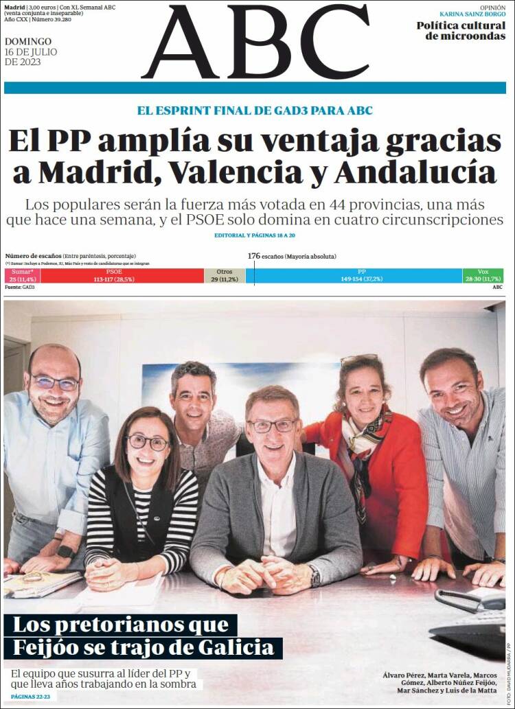 "El PP amplia el seu avantatge gràcies a Madrid, València i Andalusia", diu l'ABC. El diari té clar que els populars seran la força més votada en 44 províncies, una més que el que deien les enquestes fa una setmana. La fotografia sembla la que es fa una família després d'un dinar, però en aquest cas són Feijóo i les seves mans dretes, els assessors que es va portar de Galícia quan va fer el salt a la política nacional; es tracta de "l'equip que parla a cau d'orella a Feijóo i que porta anys treballant a l'ombra". Per cert, sense sorpresa, l'enquesta del diari dona opcions de governar al PP si suma esforços amb Vox.