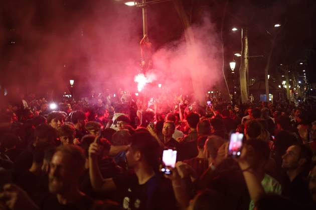 Y la celebración se ha trasladado a la Fuente de Canaletes. Los culés han acudido en masa y rápidamente hacia la localización de celebración de los títulos del Barça, en La Rambla de Barcelona. Miles de personas, pasada la 1 de la madrugada, no han dudado en hacer acto de presencia en el lugar de encuentro para vibrar con más culés.