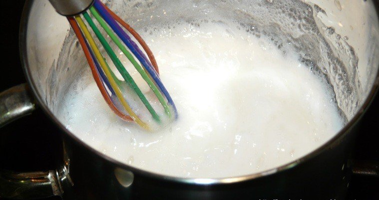 Primero prepararemos la glasa y después el almíbar... y los mezclaremos a temperatura de punto "bola fuerte". Nos hará falta una termómetro de cocina... a no ser que sepáis como llegar al punto de "bola fuerte" según el método tradicional. El primer paso es preparar la glasa en frío: azúcar glacé en un 80% y agua en un 20%, hasta obtener una masa homogénea en la cual daremos color que más nos guste.