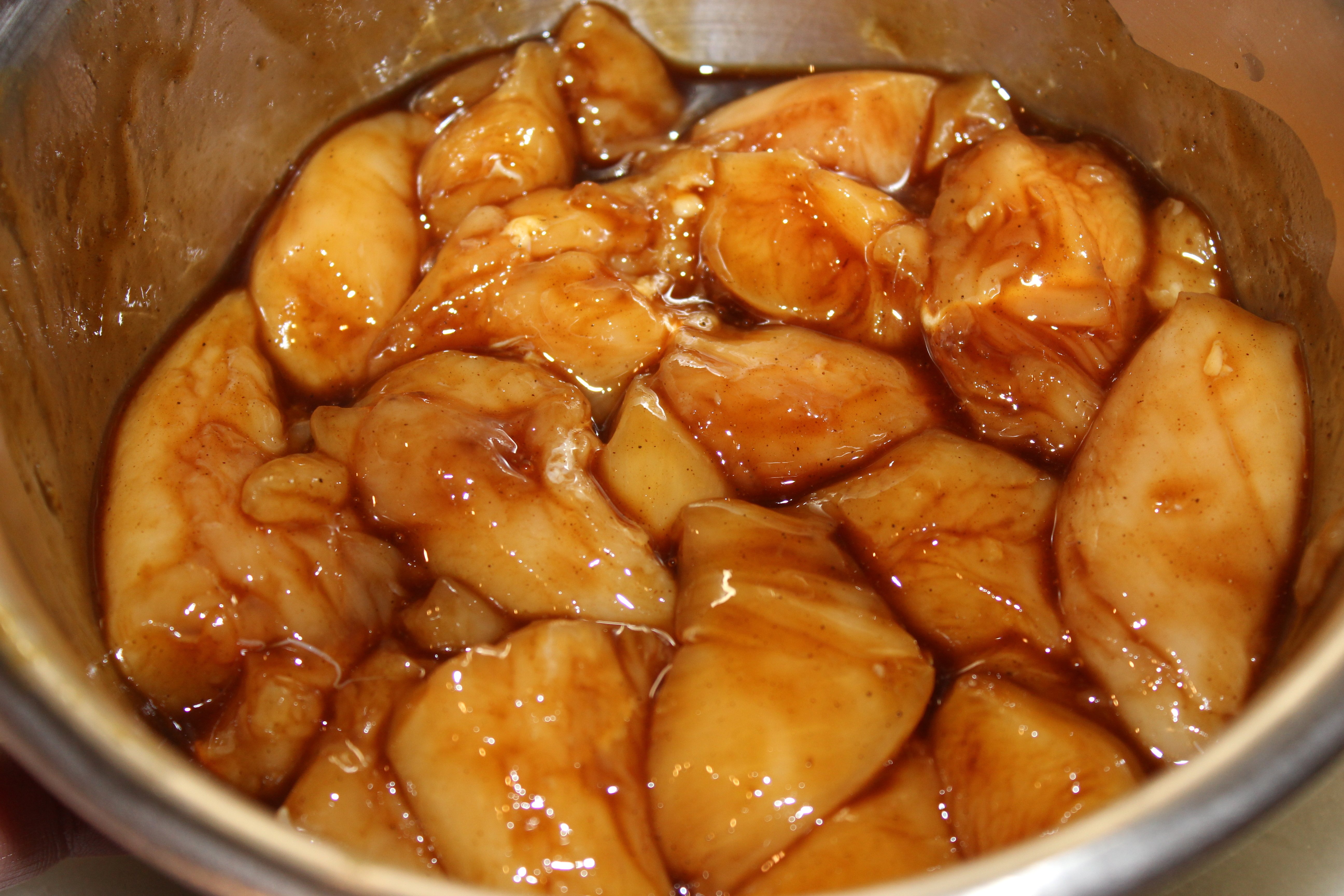 Primero, tenéis que poner el pollo cortado en dados a marinar con la salsa de soja. Si lo tenéis un par de horas mejor.