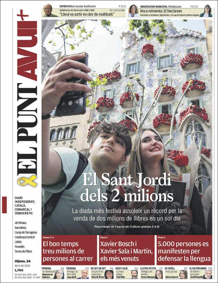 Finalmente, “un Sant Jordi descomunal” en la portada de El Periódico, y un “Sant Jordi que desborda las calles” en La Vanguardia, son los protagonistas de este jueves en los citados diarios que celebran el éxito de la diada. Y es que las cifras de cierre del Sant Jordi han certificado lo que se palpaba en la calle desde primera hora: la diada ha sido de récord. Según los datos provisionales de la Cámara del Libro, se han facturado 26 millones de euros y se han vendido 2 millones de ejemplares. A la espera todavía de sumar las ventas en las paradas de la calle, se estima que será la mejor de la historia y se sostiene, así, la tendencia creciente de los últimos años. Por su parte, el presidente del Consejo de Gremios y del Gremio de Floristas de Catalunya, Joan Guillén, ha celebrado los dos millones de rosas vendidas. Por cierto, que La Vanguardia también explica que “la compra de munición en Israel divide más el Gobierno de coalición”. La compra de munición por parte del sector socialista del Gobierno a una empresa israelí ha provocado una crisis interna profunda en la coalición, “mucho más grave que el anuncio del incremento del gasto en defensa hasta el 2% del PIB hecho por Pedro Sánchez”, apunta. Mientras Sumar pide una rectificación inmediata del contrato y la comparecencia del ministro del Interior, intentando mantener el pulso político sin romper del todo, Izquierda Unida va más allá y abre la puerta a abandonar el Gobierno, reclamando una reunión urgente con Yolanda Díaz y el resto de fuerzas del bloque confederal para replantear su papel dentro del Ejecutivo. ¿Qué dicen el resto de portadas de este jueves?