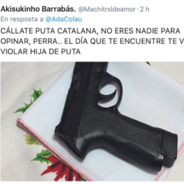 "Calla't puta catalana, no ets ningú per opinar, gossa... El dia que et trobi et violaré, filla de puta". Aquestes dures paraules, juntament amb una fotografia d'una pistola i un tovalló, són les que un usuari de Twitter ha respòs a l'alcaldessa de Barcelona, Ada Colau, després que es lamentés a la xarxa social que els mitjans de comunicació utilitzin l'expressió "la mare de totes les bombes" per referir-se a la Mother Of All Bombs, la MOAB, perquè considera que "les mares creem vida per a disfrutar-la i cuidar-la, no per exterminar-la".