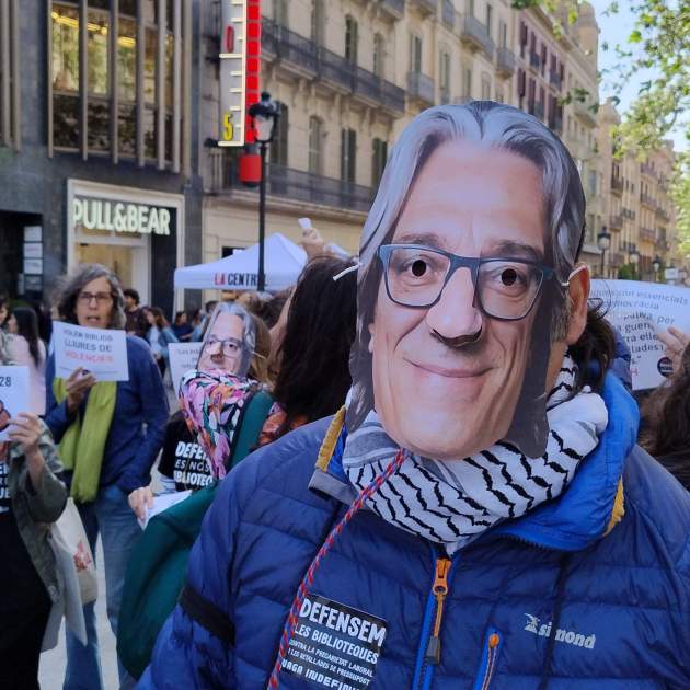 Els bibliotecaris de Barcelona continuen les seves protestes per aconseguir millores laborals i en aquest context, no hi havia millor diada que la de Sant Jordi, Dia del Llibre, per fer sentir les seves protestes. I ho han fet, a més, en un nou espai de Sant Jordi, el Portal de l’Àngel, que enguany s’estrena com a substitutiu temporal de la Rambla, en obres, i ho ha fet en un ambient força festiu. En tot cas, tocant a la plaça de Catalunya, un grup de bibliotecaris ha expressat les seves protestes, amb una curiositat, els concentrats duien caretes de Xavier Marsé, regidor de Cultura de l’Ajuntament de Barcelona.