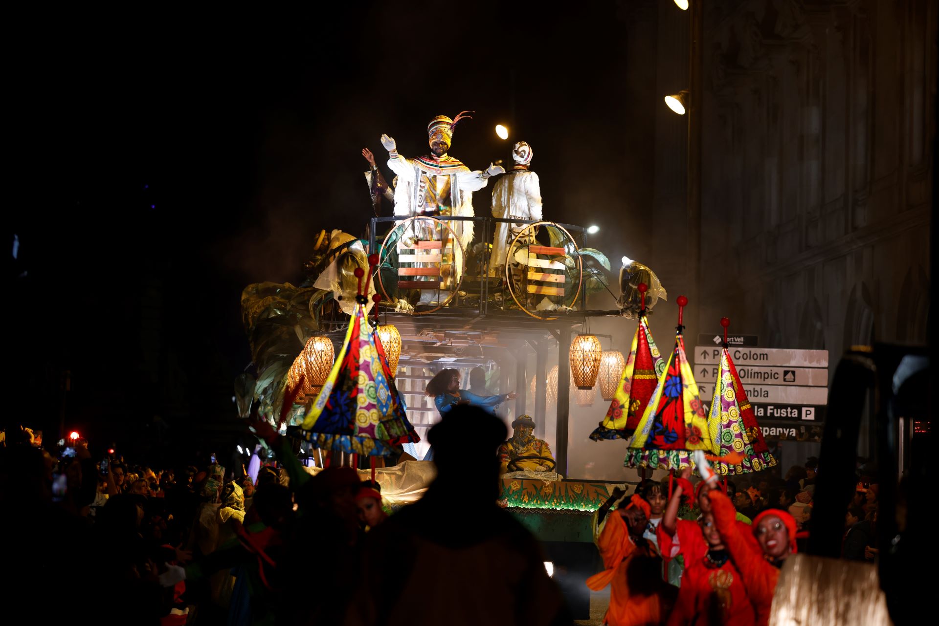 "Bona nit a tothom", diu el rei Melcior a l'avinguda Paral·lel. Acompanyat dels ballarins amb ales de papallones, no deixa ningú indiferent