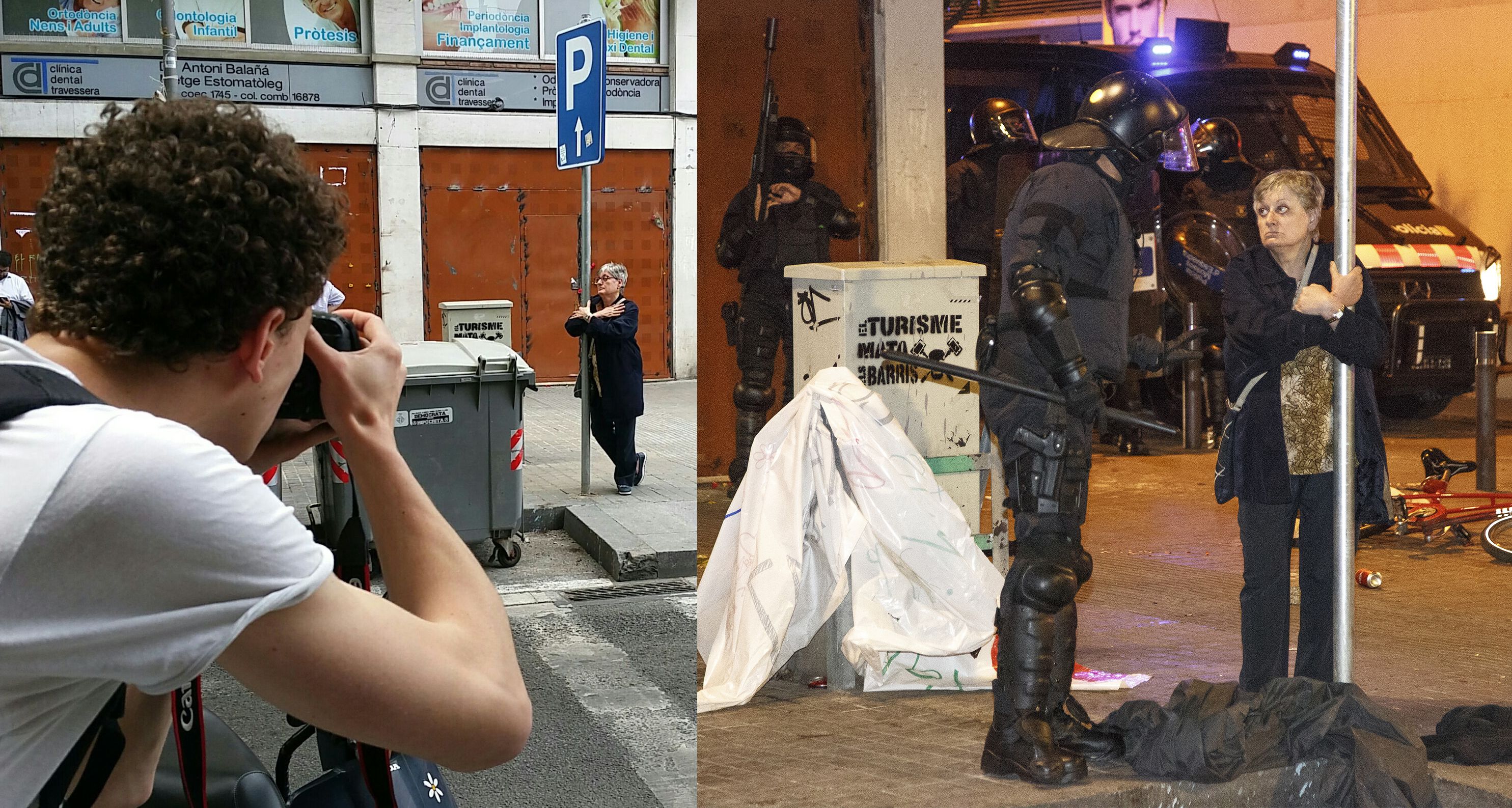 De cop van començar les corredisses i per això em vaig agafar al pal d'un senyal. Llavors, van venir els Mossos dient que marxéssim tots però jo vaig voler quedar-me allà per veure qui eren els que ho començaven tot. Més tard, em va venir aquest policia i em va tornar a dir que marxés.