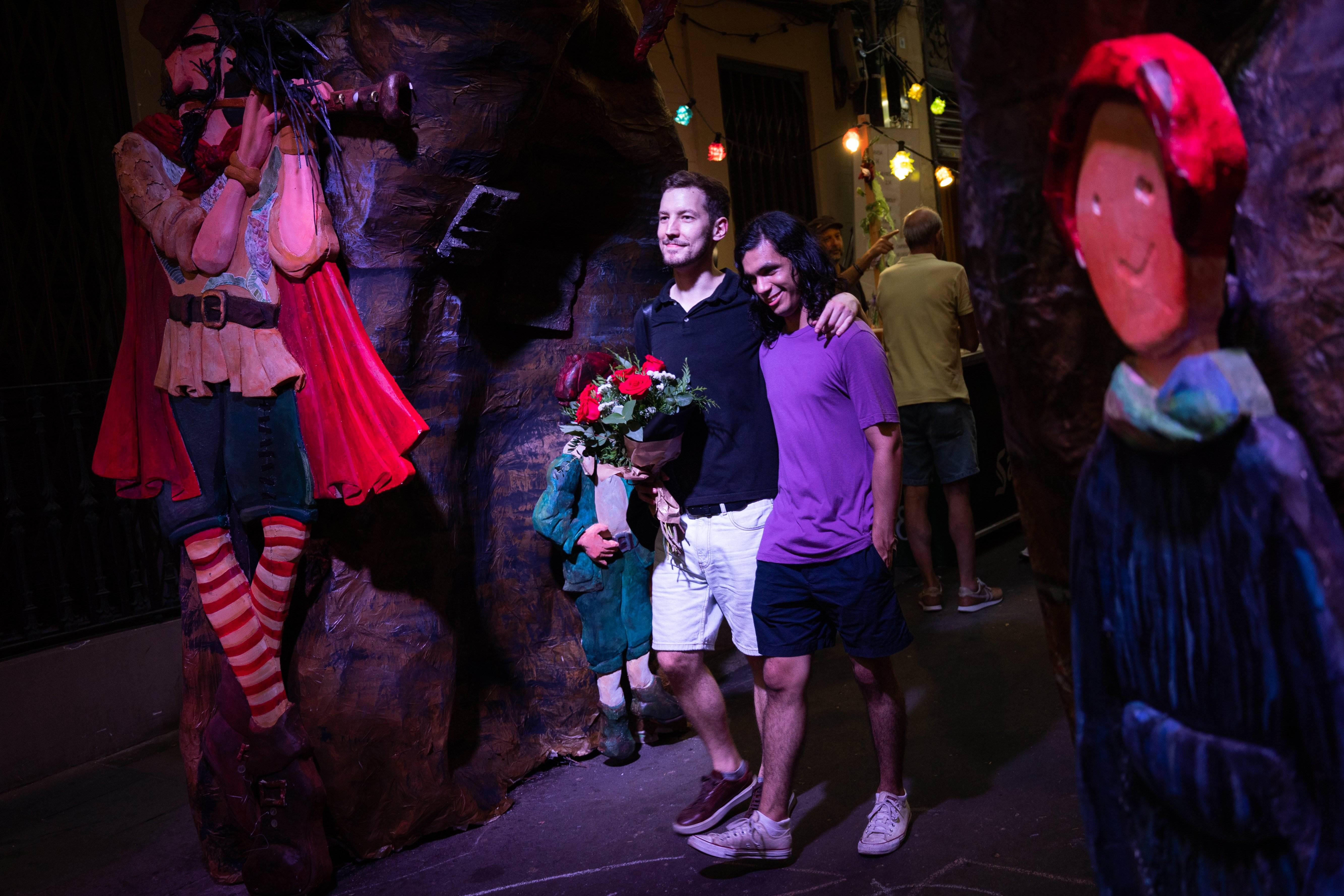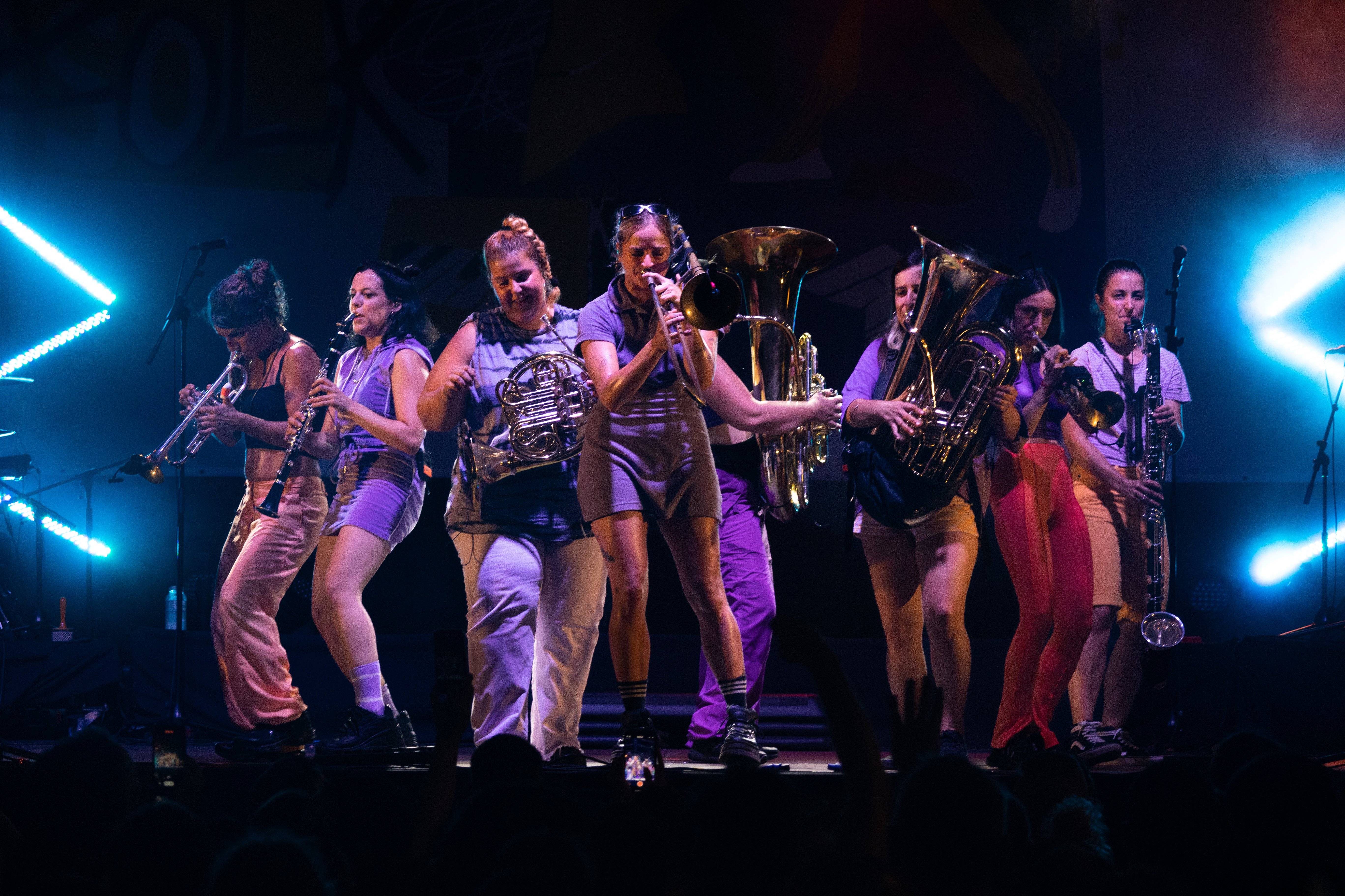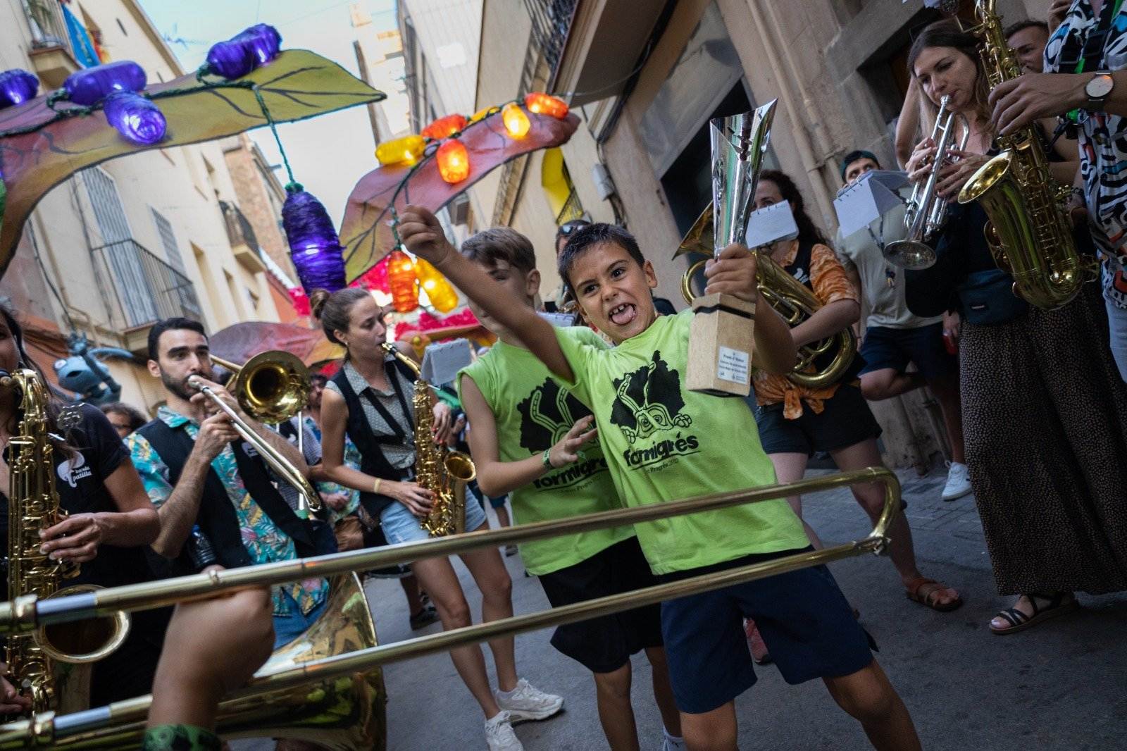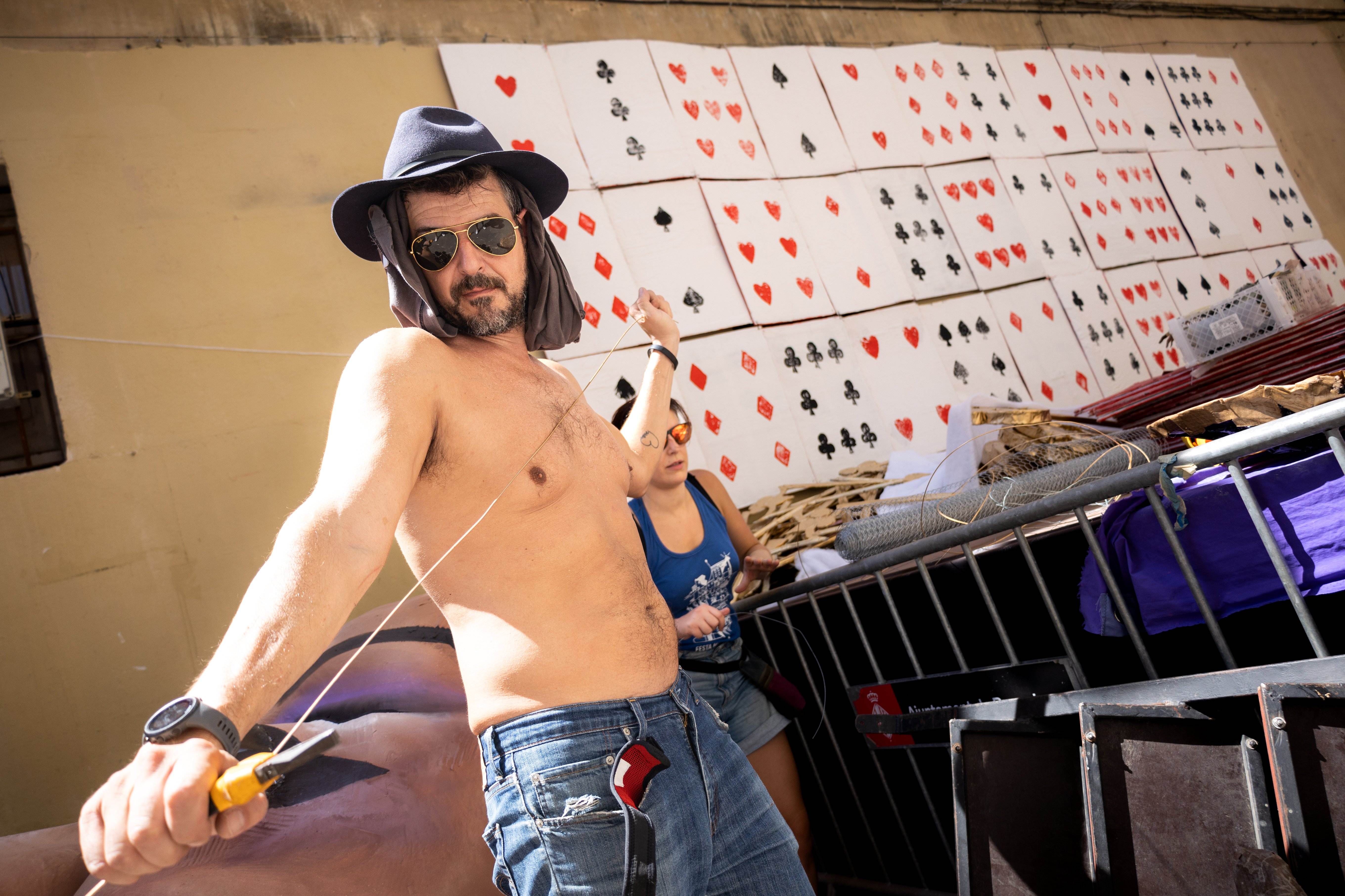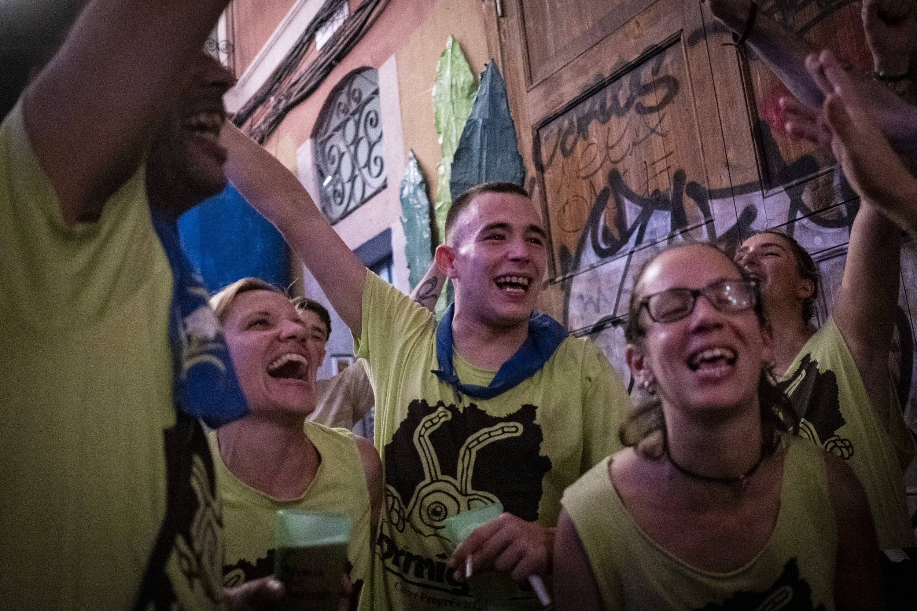 L'Àguila de Gràcia balla al centre de la plaça de la Vila després del pregó que dona començament a la festa major del barri. Els pregoners d'aquest any son Andrea Porta, excapitana de l'equip femení del CE Europa, on va jugar durant 10 temporades, i Àlex Cano, l'actual capità de l'equip masculí. / Foto: Miquel Muñoz.