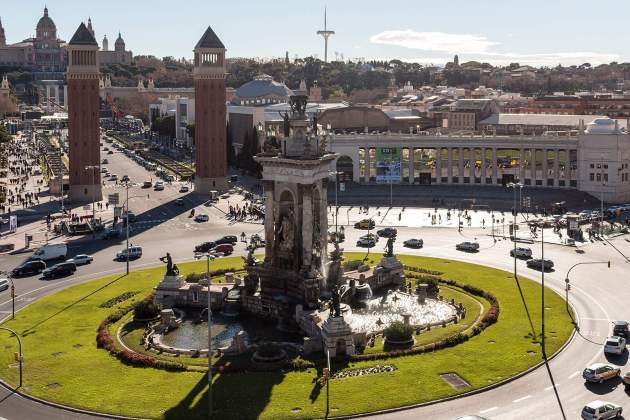 Actualment, la plaça d’Espanya és, principalment, una gran rotonda de regulació del trànsit, com ho pot ser la plaça de Francesc Macià, perquè totes dues tenen la característica que l’espai central no és accessible per als vianants. A la plaça Espanya, el cercle central està marcat per la presència de la font -ara inoperant per la sequera- que commemora l’Exposició Universal del 1929 i que oficialment s’anomena Font dels Tres Mars perquè és una al·legoria als mars que banyen la península Ibèrica, i tota ella està envoltada de gespa, en un espai on no hi ha cap facilitat perquè els vianants hi puguin accedir. N’hi ha prou amb pujar a la terrassa del centre comercial Les Arenes per copsar que l’espai central de la plaça és zona vedada als vianants.