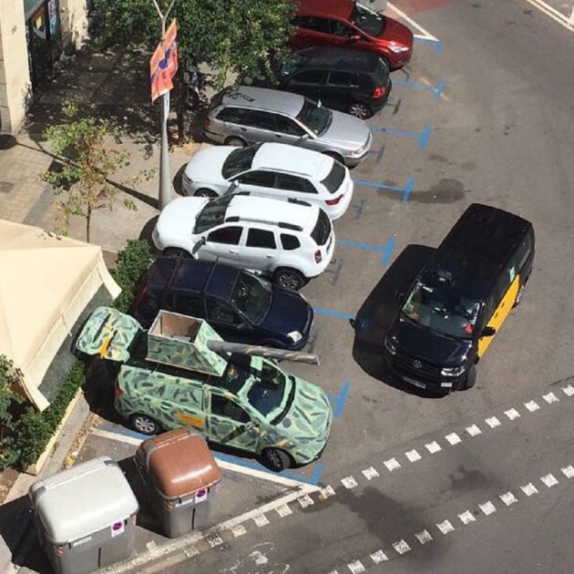 El sector del taxi segueix lluitant contra les llicències de lloguer de vehicles amb conductor (VTC) i avui hi ha una vaga de 24 hores que finalitzarà a les 6.00 hores d'aquest divendres. Una de les accions que han dut a terme ha estat convertir un taxi, ja irreconeixible, en el que sembla ser un tanc.