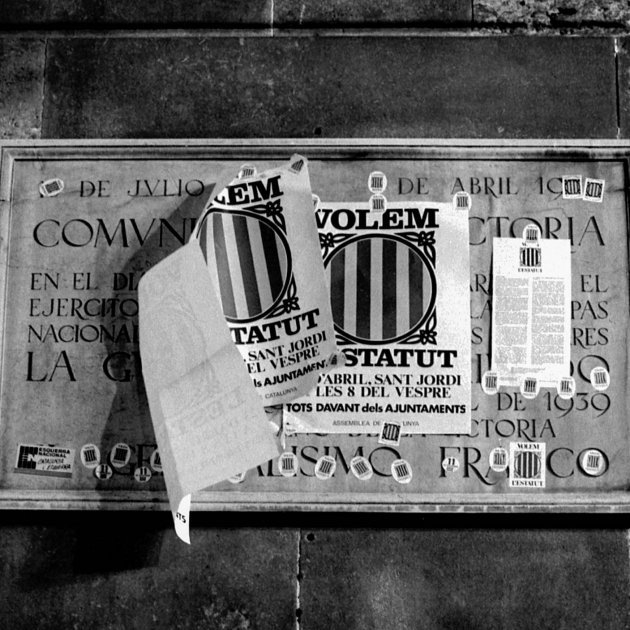 Imatge principal: La reivindicació de l’Estatut de Catalunya, continguda en aquests cartells que criden a la mobilització ciutadana per al 23 d’abril del 1977 i que tapen simbòlicament una placa que rememora el comunicat de l’1 d’abril de 1939 amb què Franco proclamava la seva victòria a la Guerra Civil. Firma: ©Carlos Bosch/UPIFC