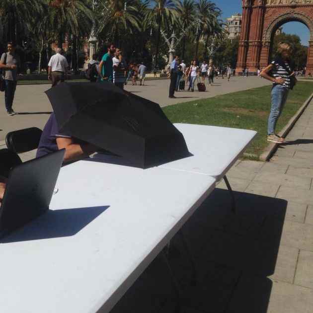Uns opten per envair els bars i cafeteries del voltant per poder escriure. D'altres, com el de la foto, per muntar-se una tenda de campanya amb un paraigua talment com si fos un para-sol, o com si fos Mary Poppins.
