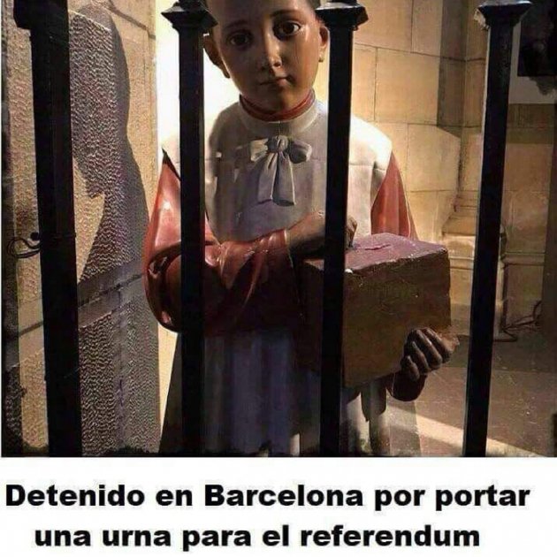 La monja Sor Lucía Caram, que s’autodenomina com a “inquieta i inquietant”, s’ha sumat a l’onada de missatges irònics sobre la confiscació per part de la Guàrdia Civil de material per al referèndum, mostrant la imatge de l’estàtua d’un escolanet amb un peu de foto que el descriu com a “detingut a Barcelona per portar una urna pel referèndum”.