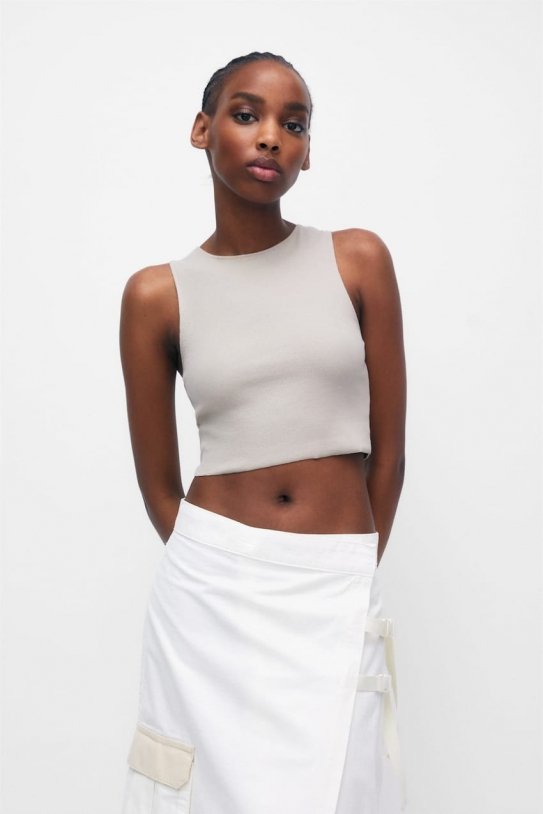 A més de ser un top en canalé amb textura agradable i que és un clàssic per a la temporada de sol, aquest és un disseny de Pull&Bear que s'ha confeccionat principalment en un teixit de cotó per aconseguir un tacte delicat i combinant amb viscosa per a un millor emmotlli a la figura, a més de comptar amb elastà per a un acabat més precís.