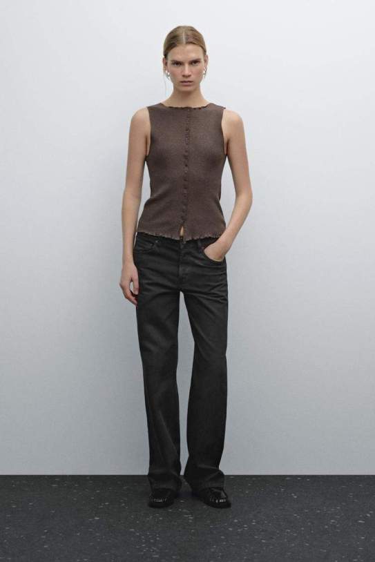Aquesta armilla compta amb un teixit de punt de canalé que aporta estructura i comoditat, adaptant-se al cos amb suavitat però mantenint la seva forma després dels usos. El detall de la tira cordada al frontal no només summa practicitat, sinó també una picada d'ullet elegant a l'estil clàssic renovat, propi de la firma Massimo Dutti. A més, el color marró que té és perfecte per combinar amb absolutament tot, des de texans de tir alt fins a pantalons sastre o faldilles midi vaporoses, pel que serà un gran aliat a la teva col·lecció a l'hora de vestir.