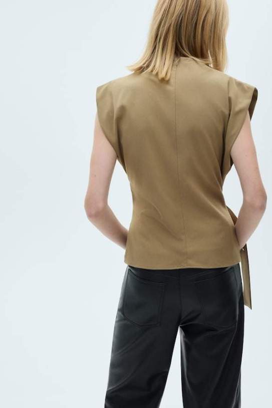 El disseny sense mànigues de la brusa reforça el seu estil airejat i lleuger, sent una excel·lent opció per als dies més càlids, però també fàcil de combinar amb peces exteriors com blazers o jaquetes en temporades més fredes.