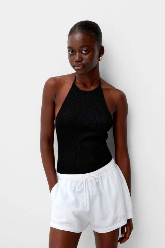 El bodi halter amb esquena descoberta de Bershka és una peça de moda que combina elegància i sensualitat en un sol disseny. Aquest bodi presenta un estil halter, caracteritzat per la seva manera de lligar-se al voltant del coll, el que deixa les espatlles i l'esquena al descobert, creant una aparença atractiva i sofisticada.