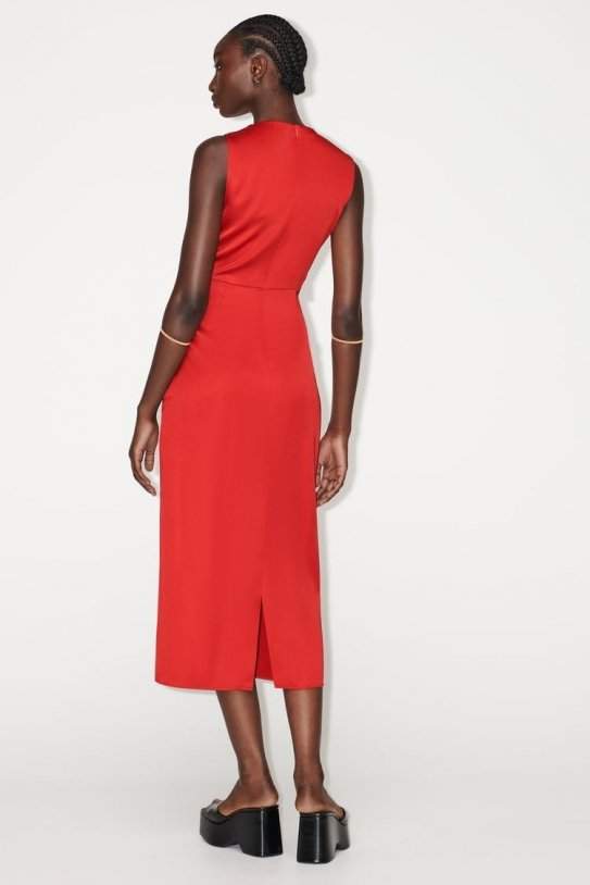 El vestit midi setinat sense mànigues en llis és la definició perfecta d'elegància i sofisticació. El seu tall midi i disseny sense mànigues fan d'aquest vestit un must-have per a qualsevol ocasió especial. El color vermell brillant li donarà un toc vibrant i alegre al teu look. És de coll rodó i compta amb detall de davanter creuat amb obertura a pit, en la part baix ve amb obertura a esquena compte amb tancament posterior amb cremallera oculta en costura el que fa que sigui fàcil de col·locar.