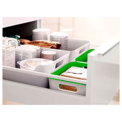 Les caixes VARIERA són perfectes per emmagatzemar aliments, condiments, flascons o objectes com a coberts o filtres de cafè. I compten amb vores arrodonides, amb la qual cosa seran molt fàcils de netejar. Això també és gràcies al plàstic amb què estan fabricades.