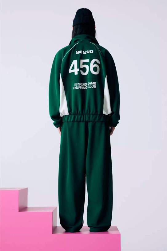 El color predominant, en un to vibrant i cridaner, reflecteix la paleta distintiva de la sèrie i ressalta detalls acuradament col·locats com els números o emblemes que evoquen directament l'univers de "El Juego del Calamar". Aquests elements estan meticulosament brodats o estampats, afegint textura i profunditat al disseny sense resultar intrusius. Les butxaques laterals, perfectament integrades a les costures, no només són pràctiques per guardar petits objectes, sinó que també contribueixen a mantenir l'estètica neta i funcional de la jaqueta.