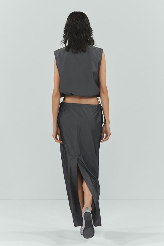 Es tracta d'una faldilla amb teixit tècnic, efecte reflector i fluid. El seu disseny és llarg i recte. Compte amb cintura elàstica ajustable, dues butxaques laterals sense tancament i una obertura posterior en el sota també compte amb folre interior. el que fa un total look. A més, ve en un color gris que combina amb tot.