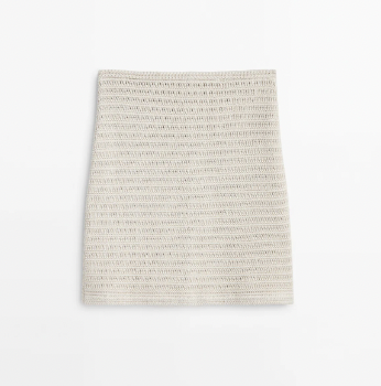 El teixit en ganxet crea un efecte únic en aquest disseny, amb acabat delicat i molt còmode per lluir aquesta falda amb el millor dels moviments i màxima delicadesa. S'ajusta amb delicadesa al maluc, comptant amb una caiguda delicada i també curta, per a un estil fresc en tot moment. És una faldilla de Massimo Dutti que compta amb un patró de línies horitzontals amb trama ajustada, i altres línies a contrast amb detalls calats que deixen veure amb delicadesa la pell, i permeten el pas de l'aire per crear un efecte fresc en tot moment.