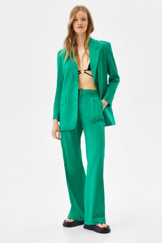 Hi ha peces que mai no passen de moda i sense cap dubte, el vestit de blazer i pantalons és una d'elles. Aquest set et salva el look en pràcticament tot moment, és extremadament versàtil, pots utilitzar-lo junt o per separat i sempre donarà un resultat d'impacte. Avui Bershka té un de perfecte pel seu disseny i color verd tendència.
