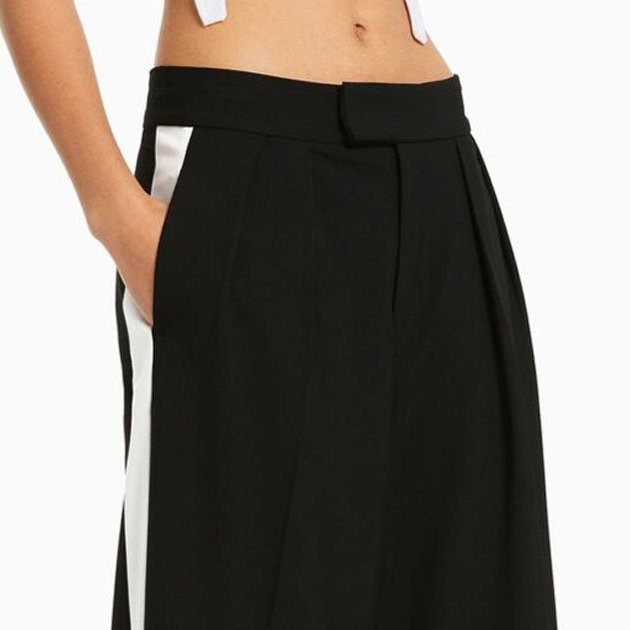 El color negre és una opció clàssica que sempre està de moda, i aquests pantalons estan disponibles en aquest color a la botiga en línia de Bershka. Gràcies a això som davant d'una peça molt versàtil. La banda lateral, d'altra banda, està disponible en un color blanc que li dona un toc de color i frescor als pantalons.