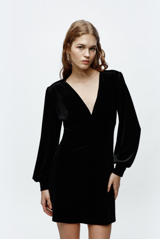 Aquest vestit és un disseny de mànigues llargues, lleugerament folgades i que s'eixamplen a prop dels punys per aconseguir un efecte de màniga bombada que agrega un volum únic i plecs delicats que són propis del teixit.