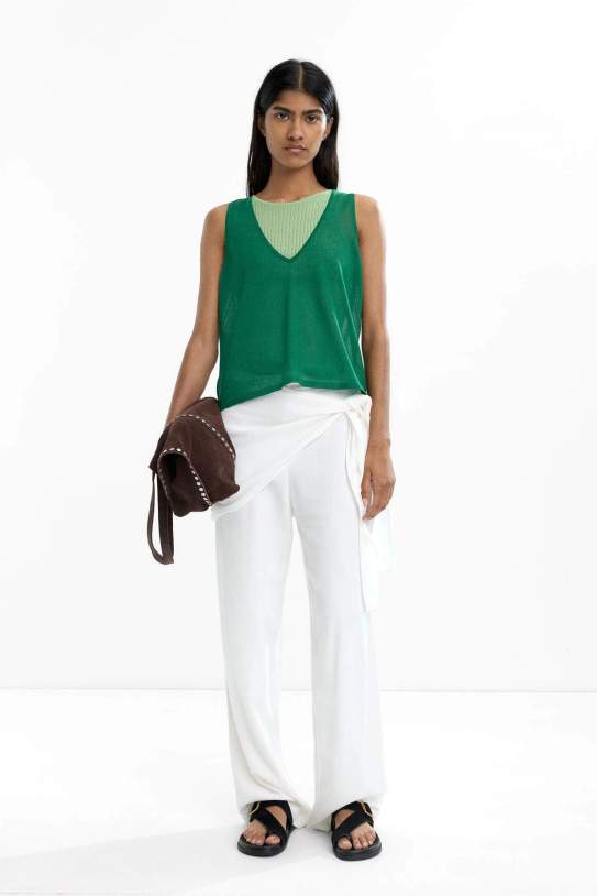 El top doble de punt de Parfois destaca pel seu disseny únic que combina dues capes en una sola peça. La capa interior presenta una textura canalada amb coll rodó, mentre que l'exterior ofereix un escot a V i màniga cava, tot en una paleta monocromàtica verda. Aquesta combinació no només aporta un toc modern i sofisticat, sinó que també proporciona versatilitat i comoditat per a l'ús diari.