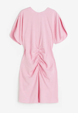 Es tracta d'un vestit curt amb costura frunzida a la cintura per a un efecte drapat, les seves mànigues són amb coll rodó, mànigues curtes obertes i cremallera oculta darrere. Sense folrar. Aquesta peça ve en un color rosa clar, un to perfecte per combinar i lluir amb el que desitgis. D'altra banda, un detall per destacar és que aquesta és una peça que s'ha confeccionat en 98% de viscosa i 2% d'elastà.