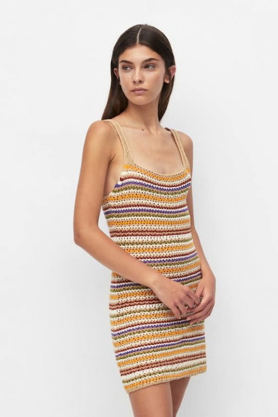 El teixit combina a més línies horitzontals, fines i que intercalen colors neutres que creguin un contrast únic, sent un vestit que trobes en tons blaus, vermells, blancs i groc, els quals combinen amb els teus calçats favorits per a l'estiu.