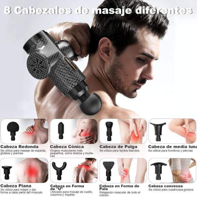 Versatilitat amb 8 capçals de massatge: Cada un dels 8 capçals intercanviables està dissenyat per tractar diferents àrees del cos, proporcionant un massatge que activa els músculs i estimula el flux sanguini, accelerant així el temps de recuperació muscular.