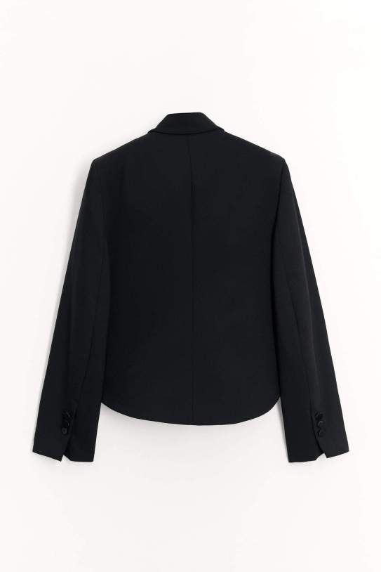 Els detalls ben pensats d'aquesta jaqueta eleven el seu disseny a un altre nivell. Els botons d'alta qualitat afegeixen un toc de distinció, mentre que les butxaques discretament integrades reforcen la seva funcionalitat. Les solapes de tall impecable i les costures ben definides mostren la cura en la seva confecció, assegurant que cada element contribueixi a un acabat elegant i refinat.