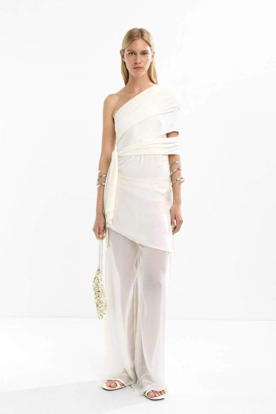 El top està confeccionat en un teixit que combina viscosa, polièster i poliamida, oferint una textura suau i agradable al tacte. Aquesta barreja de materials garanteix durabilitat i facilitat de cura. És dirigit a dones que valoren la moda contemporània i busquen peces distintives que complementin el seu guarda-roba. Actualment, el top asimètric drapat de Parfois està disponible a la seva botiga online per 49,99 euros, en color blanc i en talles XS/S i M/L.