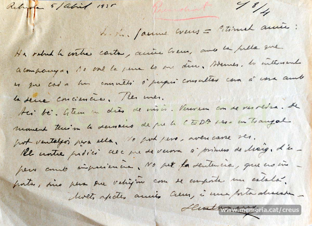 Carta de Companys a Jaume Creus, persona de confiança del difunt president Macià. Abril de 1935 / Blog Memòria