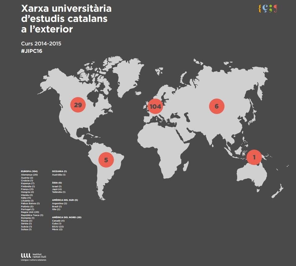 L'Institut Ramon Llull ha presentat una avaluació sobre l'estat dels estudis catalans al món. Malgrat que la globalització continua reforçant les llengües amb més parlants, el català resisteix, amb presència a 145 centres universitaris a 28 països de quatre continents, i 6.000 estudiants matriculats a primer, segon i tercer grau. La xifra es manté estable des de fa molts anys: no creix, però tampoc disminueix, tot i que el català no és llengua oficial de la Unió Europea ni de cap dels seus Estats.