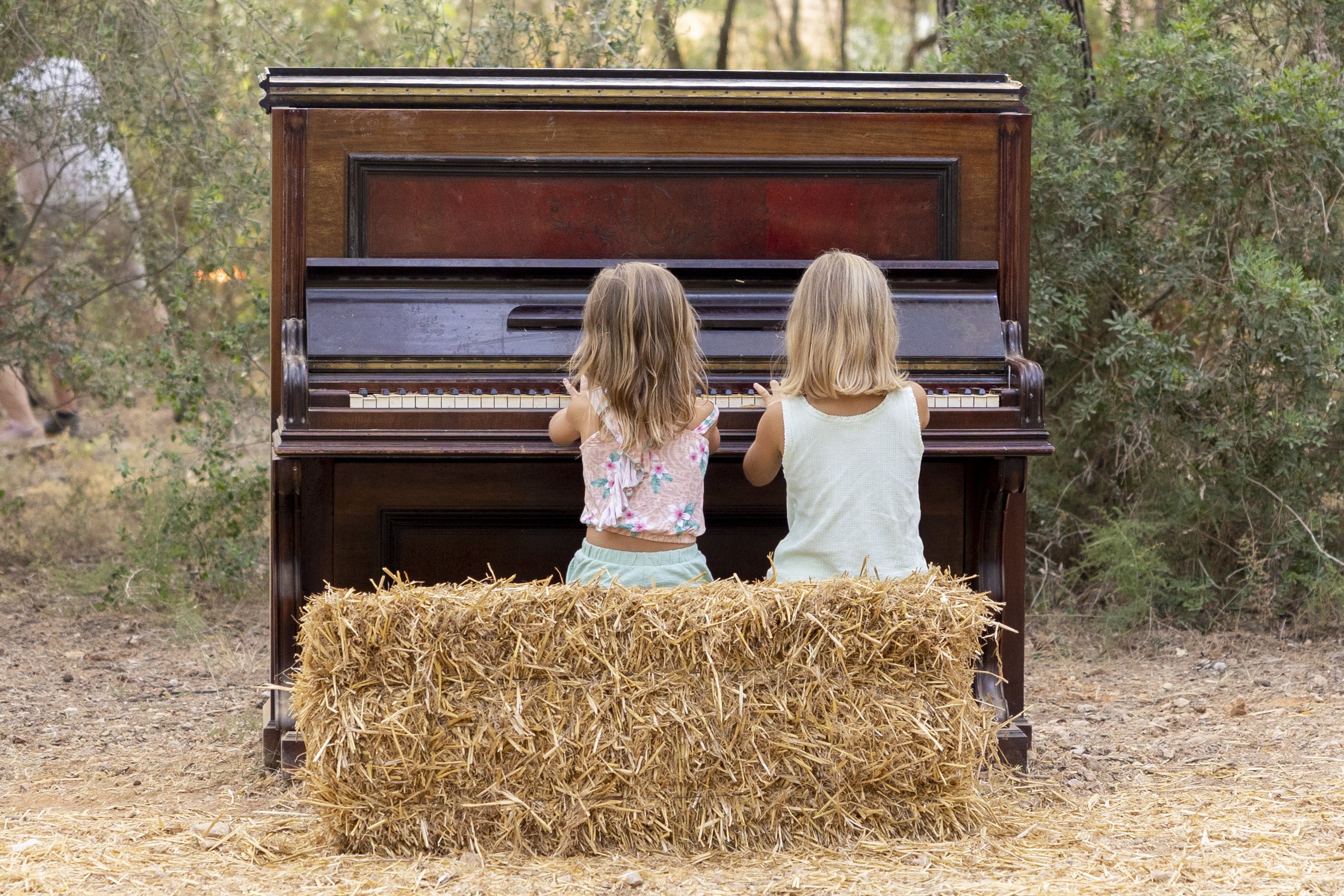 Dues nenes assegudes a bales de palla, toquen un piano vertical en el Vida Festival. / Foto: Pol Mascaró.