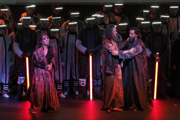 A l'inici de la vetllada, sobre l'escenari els cors, amb un vestuari futurista i unes ulleres que reflectien feixos de llum que tan aviat assemblaven aquest exèrcit que va imaginar Pink Floyd en la seva òpera-rock "The Wall" com els personatges de "Metrópolis" i aquesta escala cap a l'infinit.