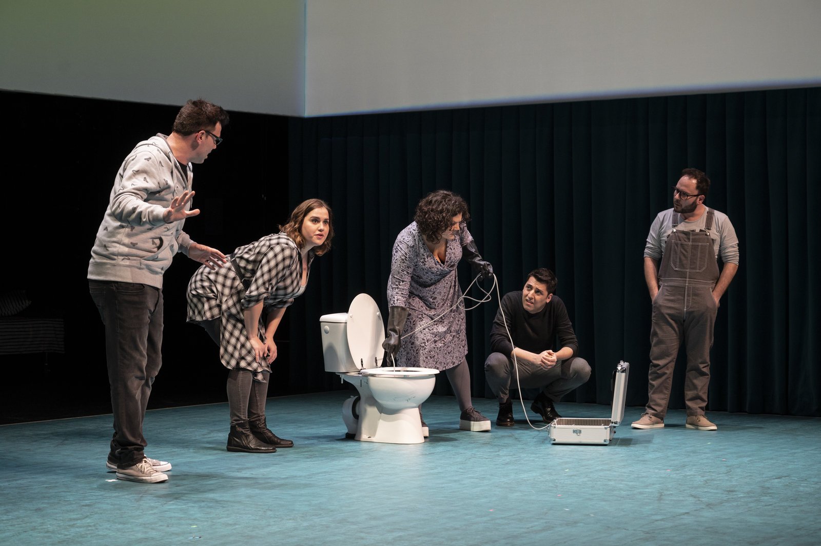 Sense ànims de fer gaire spòiler, l’obra comença amb una ponència brutal del personatge interpretat per Mònica López, una periodista negacionista que recorre platós i conferències per parlar del poca soltisme d’aquells que s’entesten a eliminar plàstics. Ella és l’alter ego de les persones que, sense interessos pel mig, creuen de veritat que no hi ha emergència climàtica. “Te n’adones que no pot ser que tots ho facin per diners, no tothom té accions de BP”, diu en Joan. I a partir d’aquesta primera audició solitària, la conjunció d’autoficció, flashos potents i actors i actrius d’una enorme bestialitat escènica fan la resta (que s’intercanviïn els rols de gènere indistintament entre dones i homes fugint de la caricaturització és una meravella escènica que, particularment, em va entusiasmar). I al fons a la dreta, un vàter omnipresent ens fa tocar constantment de peus a terra.