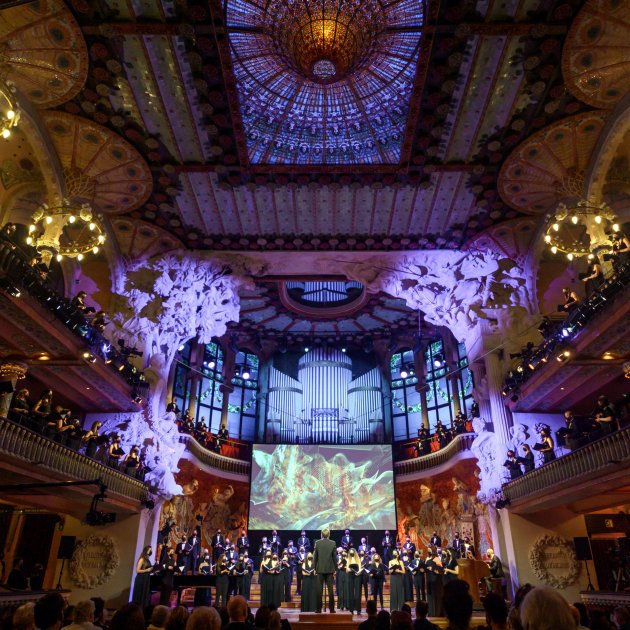 La innovadora fórmula escollida per superar les restriccions del coronavirus ha estat combinar les actuacions en directe de l'Orfeó Català, dirigit per Simon Halsey, amb els vídeos enregistrats de la resta de cors que el públic ha pogut seguir a través d'una gran pantalla.