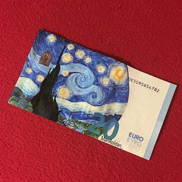 La jove de la perla de Vermeer, El dormitori a Arlés de Van Gogh o El petó de Picasso són algunes de les obres universals que estan plasmades en bitllets de 5, 10, 20 o 50 euros. També crea a partir d'obres més actuals, com La nena amb el globus de Banksy i fanarts de La Casa de Papel o Spiderman.