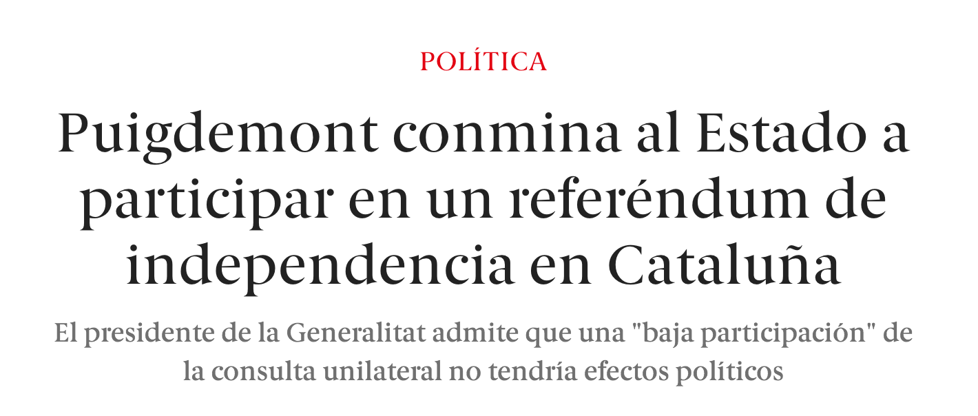 O no. Potser no és res de tot això, perquè a la portada del mateix digital es titula d’aquesta manera: “Puigdemont insta al Estado a tomar parte en un referéndum de secesión”. També ho fa així la versió d'El Español. Potser el "conminar" del titular de dins és la típica errada involuntària. Sigui com sigui, no estaria bé comminar-los a tenir més cura de la seva llengua. I de la realitat.