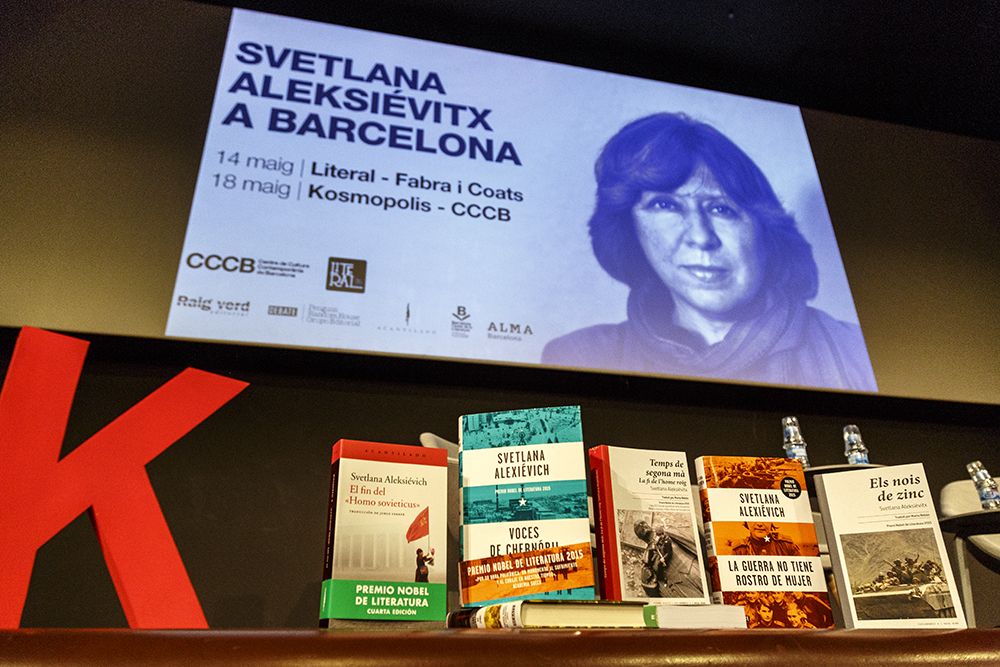 L'escriptora bielorussa Svetlana Aleksiévitx, premi Nobel de Literatura 2015, visita aquests dies Barcelona per participar en els festivals de literatura Literal i Kosmopolis. No és la primera vegada que Aleksiévitx ve a Barcelona. En realitat, té un públic fidel i diverses de les seves obres han estat traduïdes: Els nois de zinc (sobre la guerra d'Afganistan: editat per Raig Verd en català i Debate en castellà); La pregària de Txernòbil (sobre l'explosió a la central nuclear, editat per Raig Verd i Debate); Temps de segona mà. La fi de l'home roig (sobre els problemes de la transició del comunisme al capitalisme, editat per Raig Verd i Acantilado); i La guerra no tiene rostro de mujer (sobre els patiments de les dones combatents a la Segona Guerra Mundial, editat per Debate).