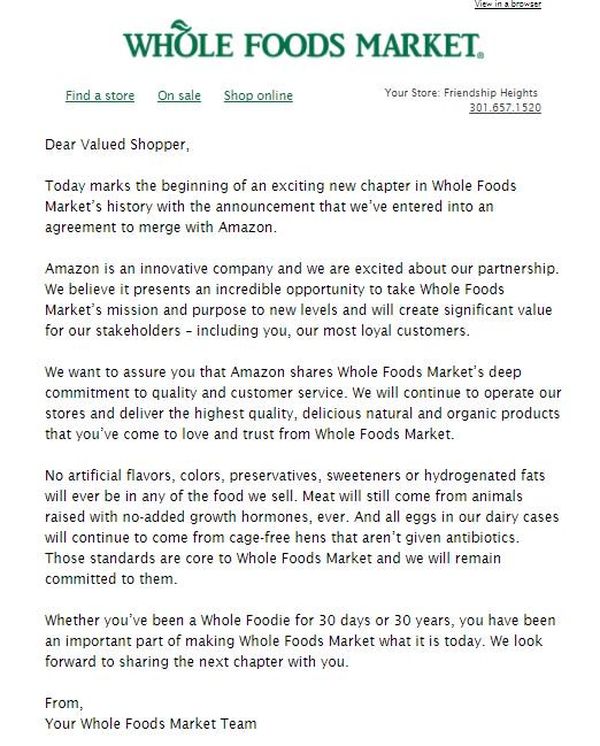 Segons es desprèn dels acords i tal i com s'ha deixat constància a la carta enviada als seus consumidors, Whole Foods continuarà operant als seus establiments sota la mateixa marca i comptarà també amb els mateixos proveïdors i socis amb qui fins ara ha vingut treballant. A més de continuar lliurant "la millor qualitat i deliciosos productes naturals i orgànics".