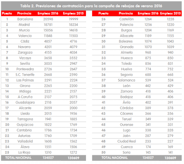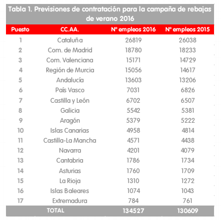 Previsions de contractació a les comunitats per la campanya de rebaixes d'estiu 2016. Taula realitzada per Adecco.