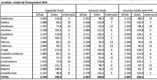 Catalunya torna a ser el tercer territori de l'Estat que més recursos tributaris aporta al sistema de finançament autonòmic. Ara bé, és el desè en rebre els recursos en termes per càpita. Així ho indiquen les dades de liquidació del model de finançament de l’any 2015 publicades pel Ministeri d’Hisenda, que un any més situen Catalunya per sota de la mitjana en el rànquing de les 15 comunitats de règim comú. Catalunya se situa 18,6 punts per sobre de la mitjana en recursos contribuïts, mentre que la posterior redistribució la situa 1,5 punts per sota de la mitjana.