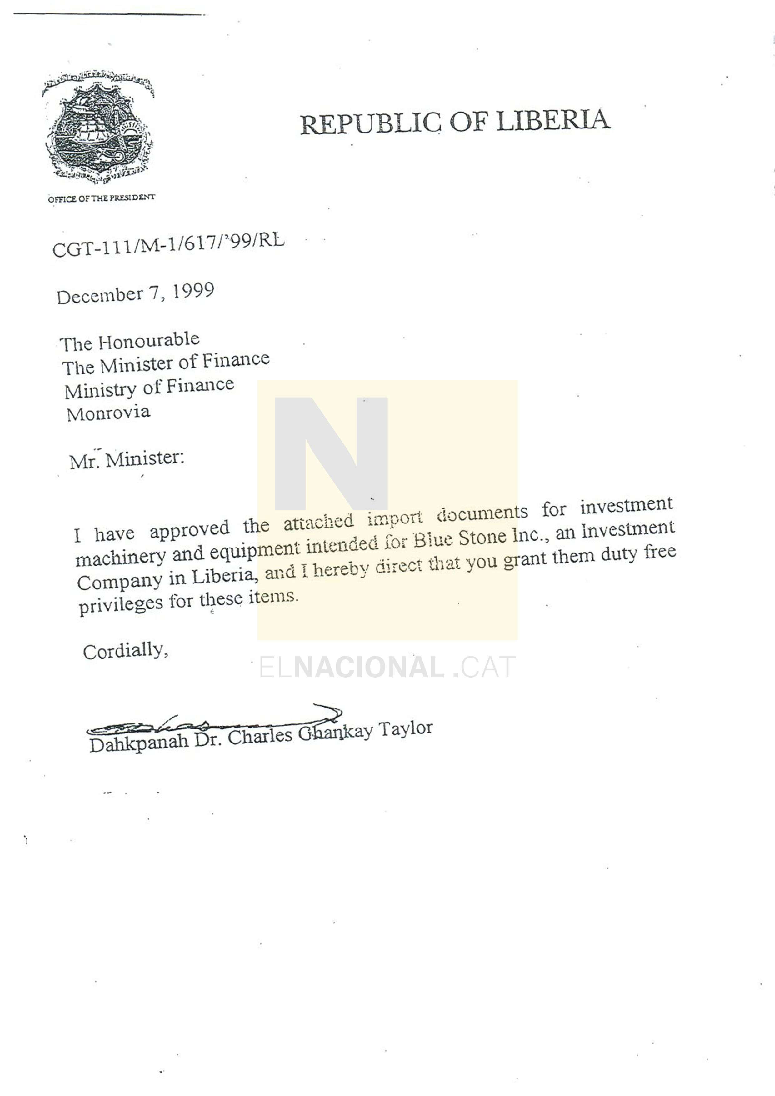 Carta de Charles Taylor al ministre de Finances de Libèria per autoritzar equipament gratuït per a la firma Blue Stone