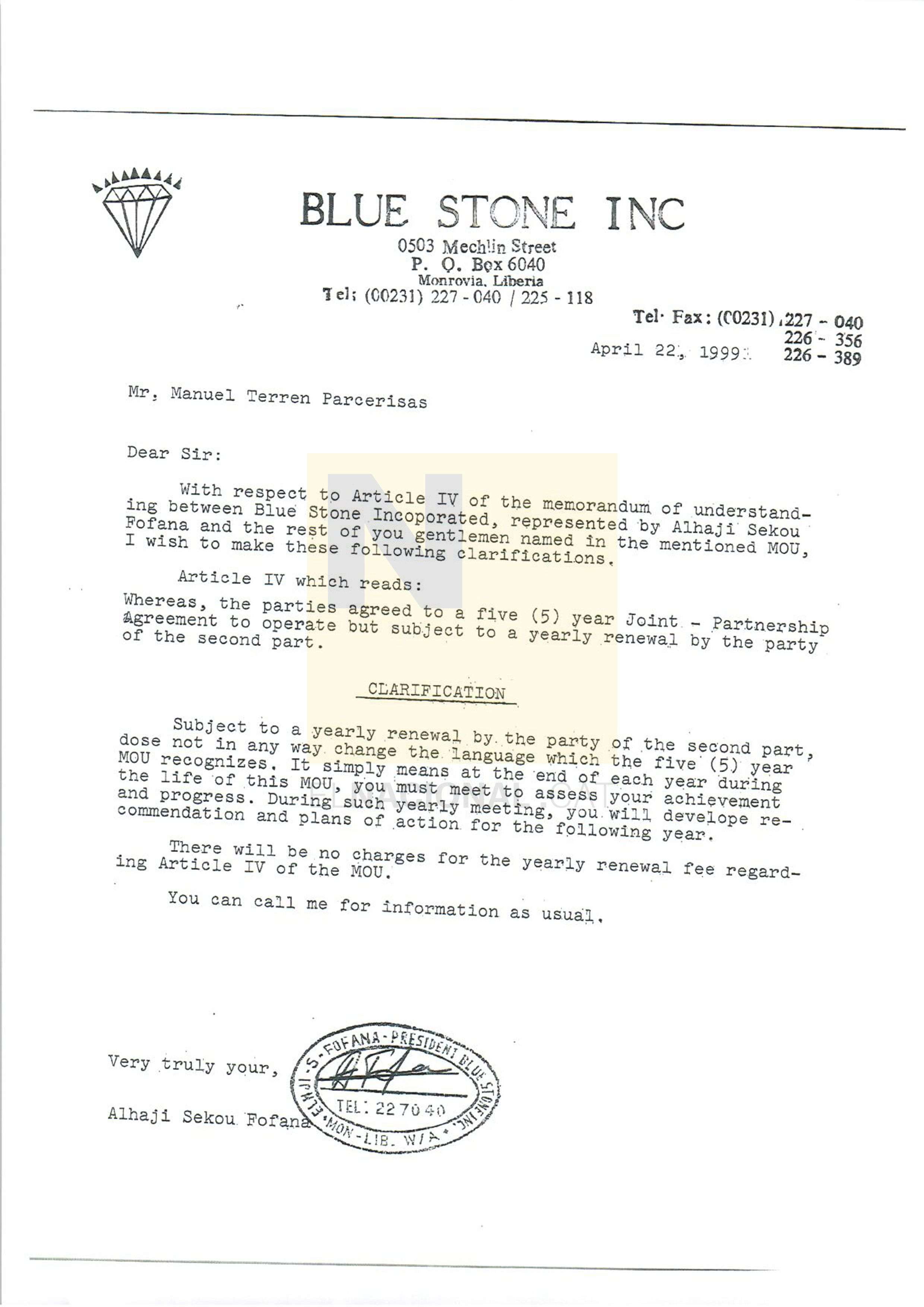 D’altra banda, el director general de NACI, Manuel Terrén Parcerisas, també estava en contacte constant amb Fofana, president de les filials d'Orfound, Blue Stone INC i DiAndorra. Un senyor de la guerra amb el qual es va firmar, amb data del 8 d'abril de 1999, un memoràndum d’entensa (MOU), és a dir, un acord bilateral per “explotar, fondre i refinar” durant cinc anys (amb possibilitat de més) mines de diamants a Libèria amb una inversió inicial de 150.000 dòlars, cosa que equival aproximadament a 130.000 euros en l'actualitat . Dos mesos abans, el llavors ministre de Territori, Mines i Energia de Libèria, A.Kpandel Fayia, ja havia autoritzat l’operació.